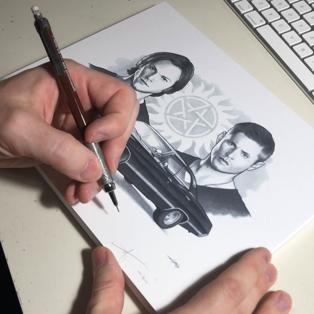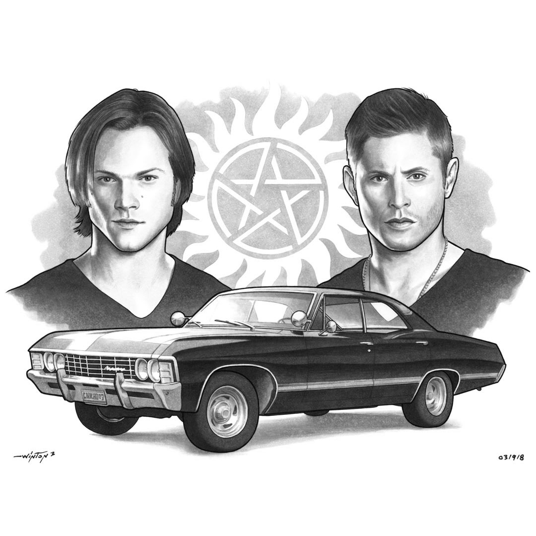 8"x10" b&w matte print of the wildly popular drawing by BYRON WINTON of the brothers from SUPERNATURAL; Sam & Dean Winchester with their Chevy Impala, 'Baby.'