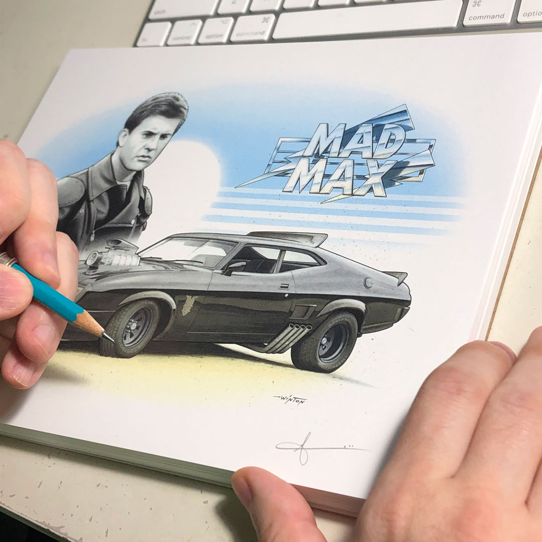Open Edition 8"x10" matte art print MAD MAX (1979) created by BYRON WINTON. B&W portrait art originally created with Copic pen and markers and then digitally colored for the print.