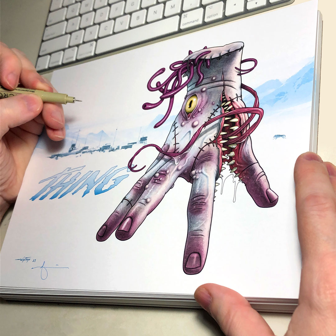 Open Edition 8"x10" matte art print mash-up of THE THING and Thing from WEDNESDAY created by BYRON WINTON. B&W drawing originally created with Copic pen and markers and then digitally colored for the print.
