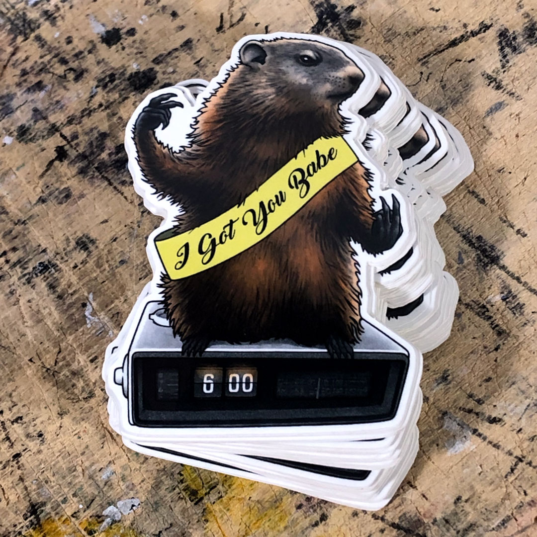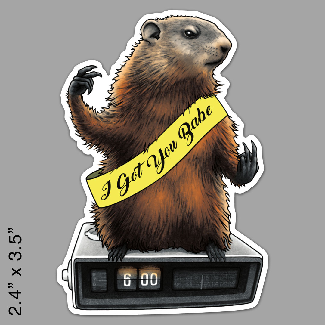 White vinyl sticker of that wild groundhog helping to illustrate the wake-up moment from the movie Groundhog Day designed by BYRON WINTON.