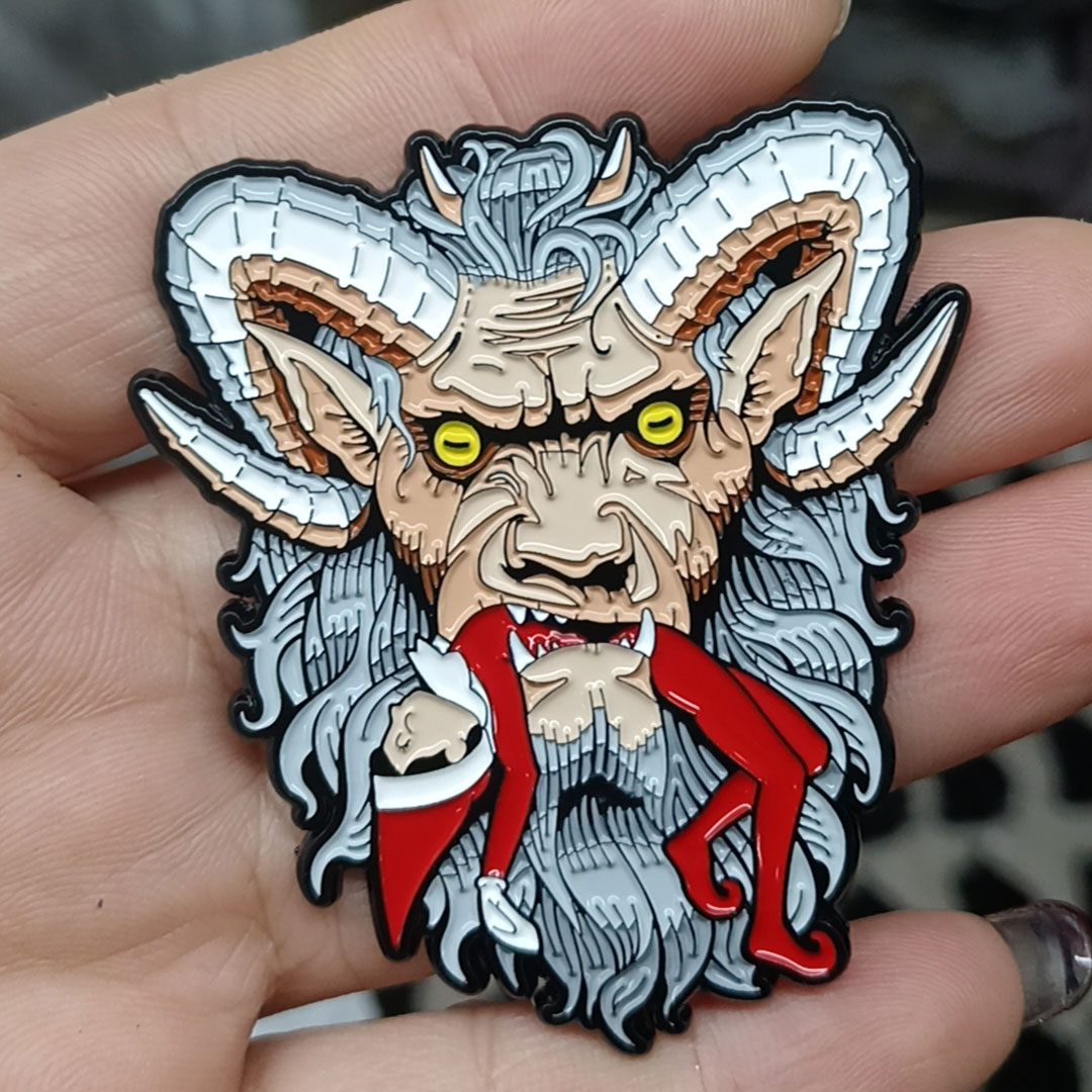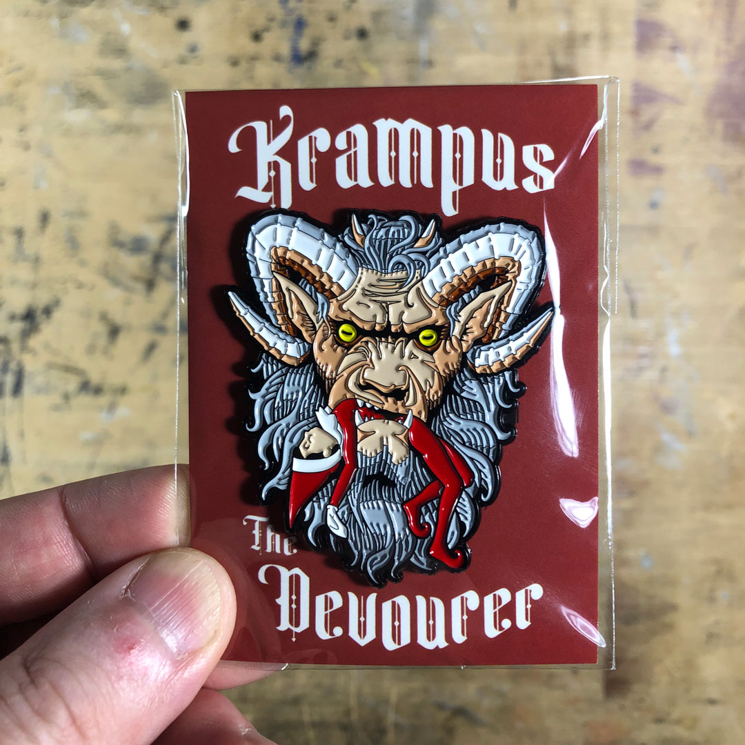 2"x2.25" An 8 color soft enamel pin (7 color for the variant) with 2 posts with rubber clasps and printed info on the back. Packaged with a collector backing card. Designed by BYRON WINTON.