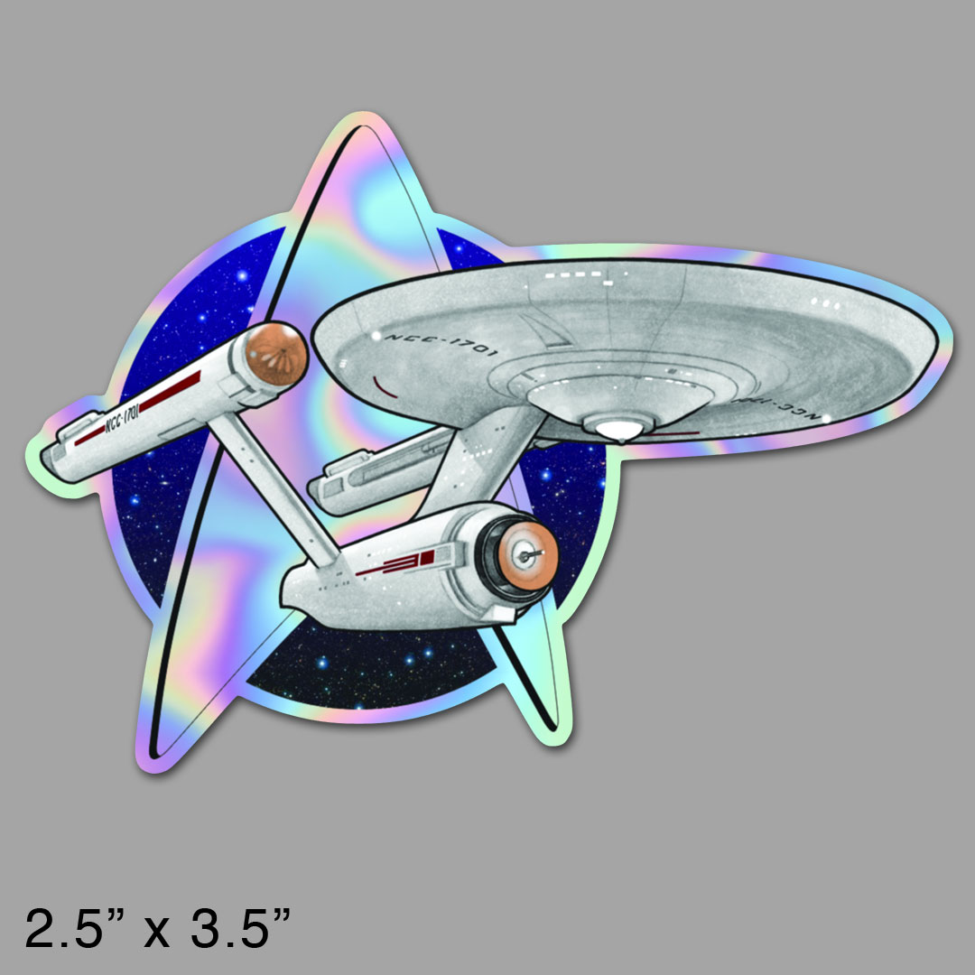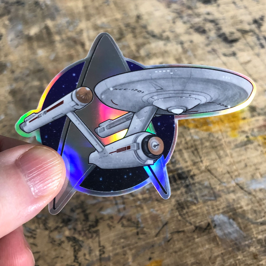 Holographic vinyl sticker of the starship Enterprise boldly designed by BYRON WINTON.