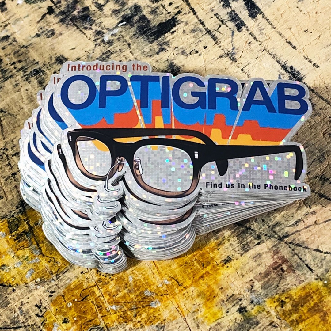 Dazzling holographic glitter vinyl sticker of the handy Optigrab from the comedy movie The Jerk designed by BYRON WINTON.