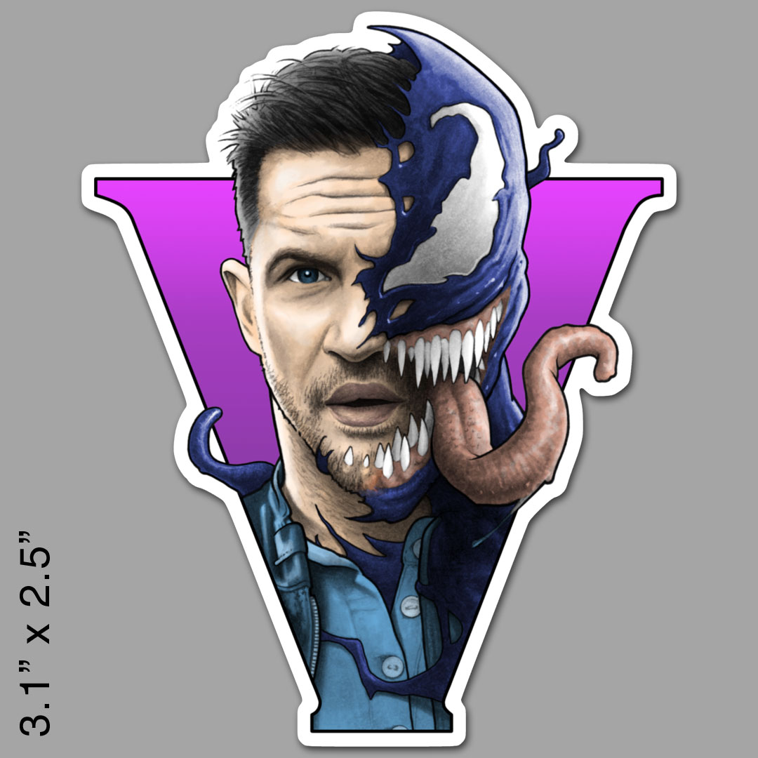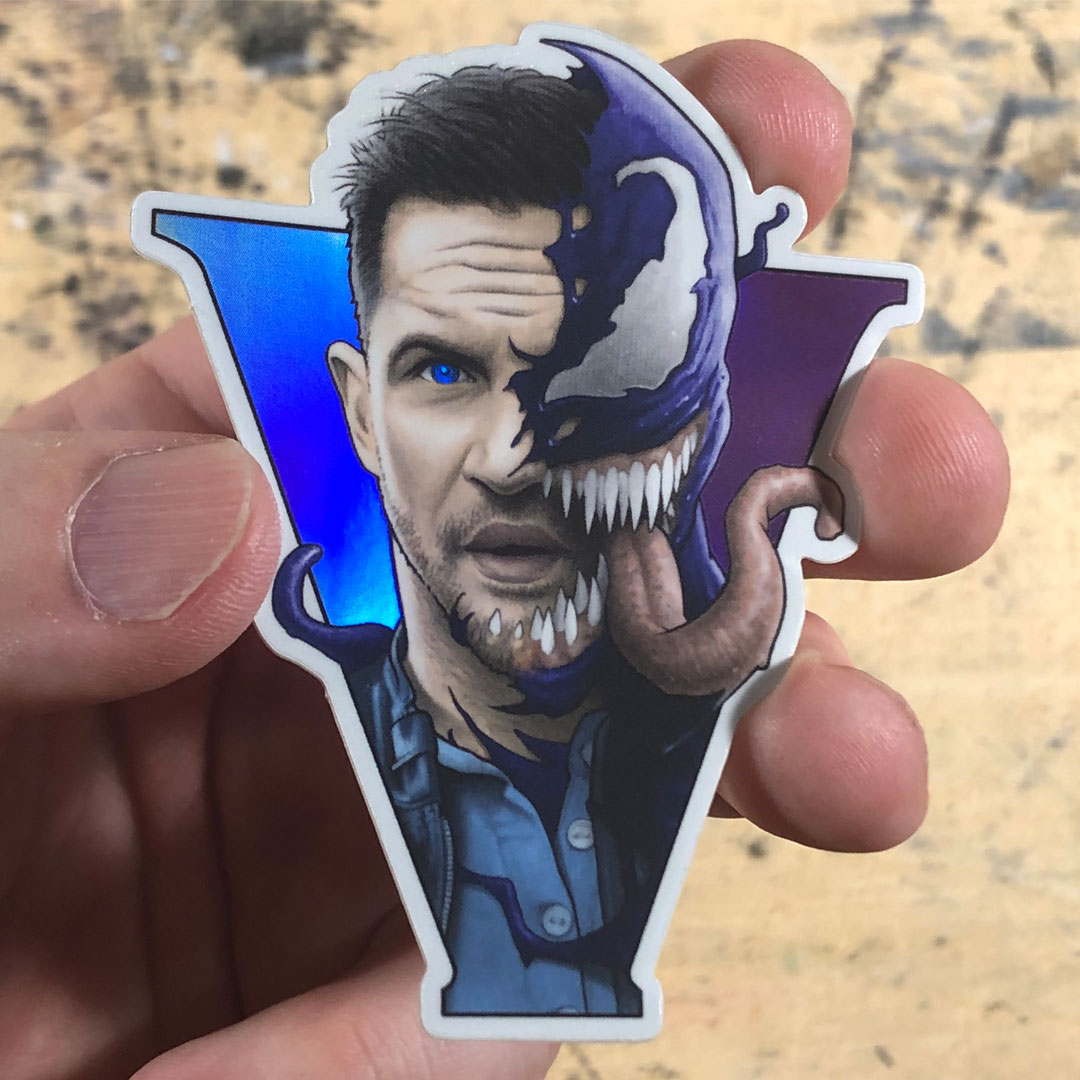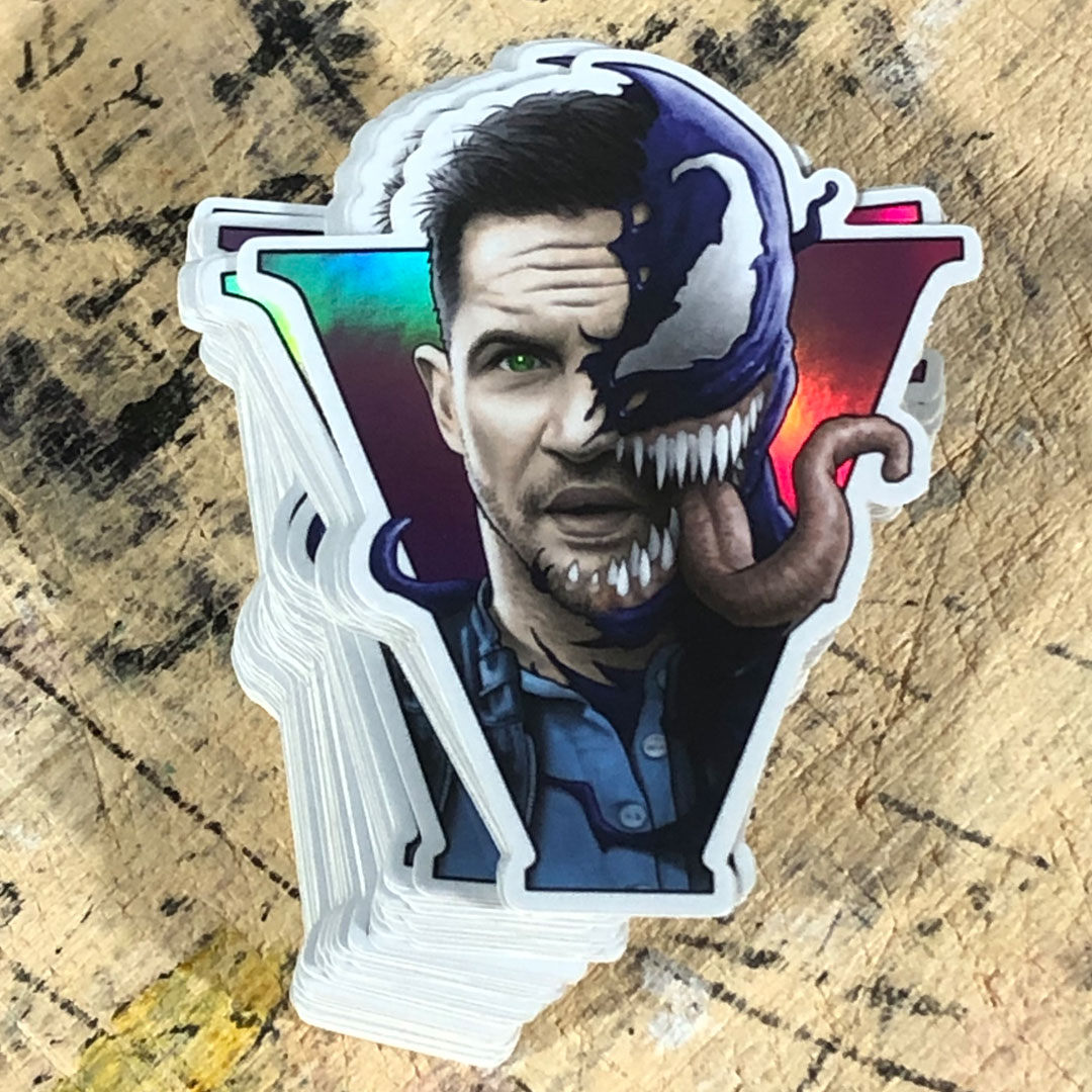 Holographic vinyl sticker of the symbiote partnership between Eddie Brock and Venom designed by BYRON WINTON.