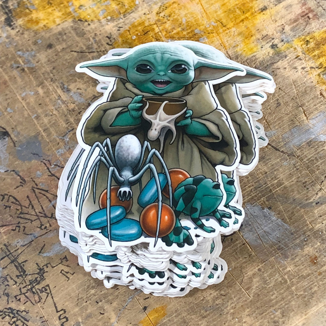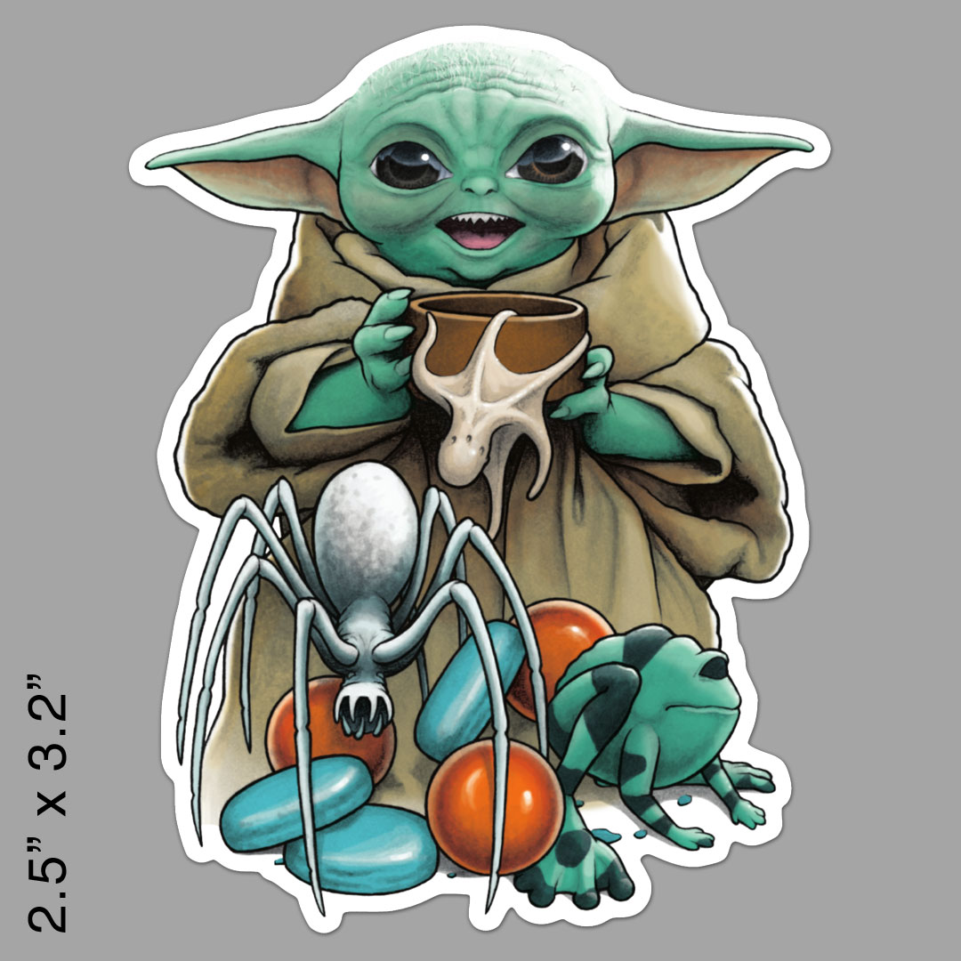 Vinyl sticker of the most adorable murderer with an appetite, Grogu from the hit Disney+ series, The Mandalorian. Art and design by BYRON WINTON.