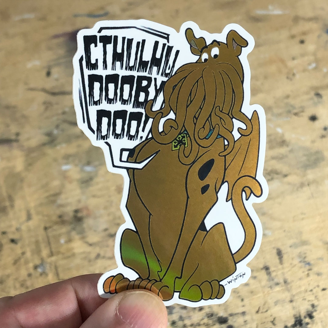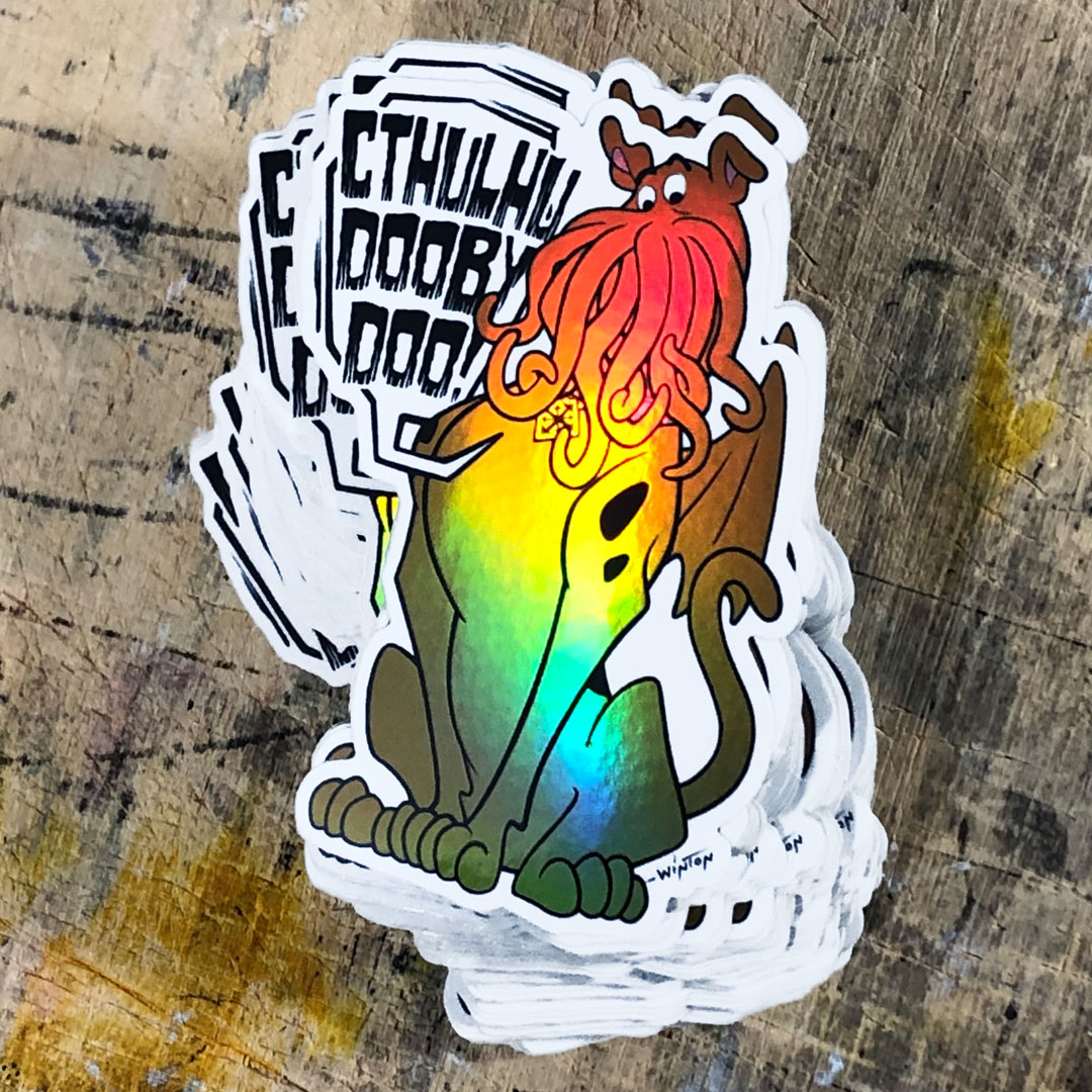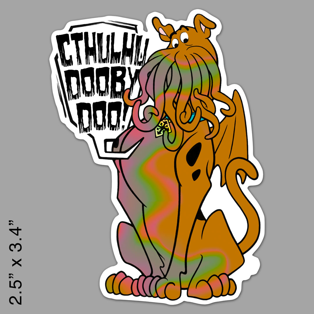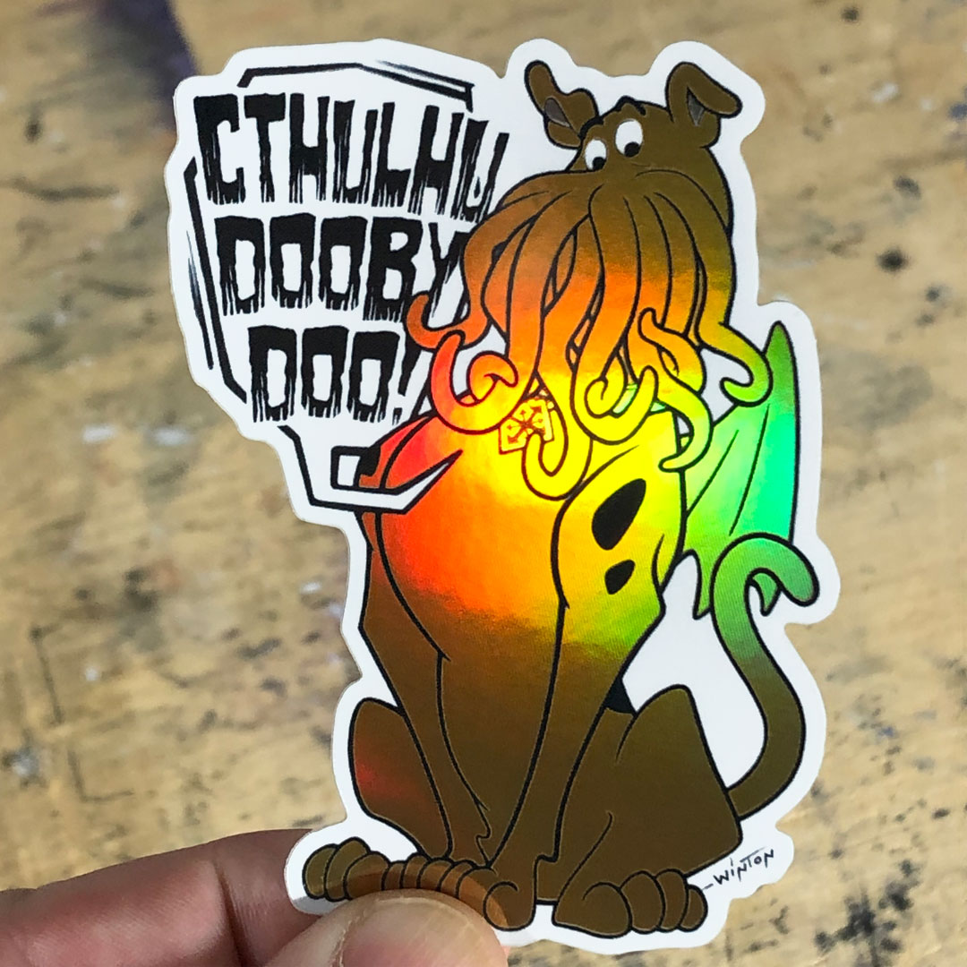 Holographic sticker mash-up of Cthulhu and Scooby Doo, designed by BYRON WINTON.