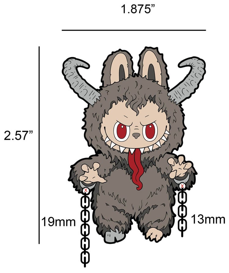 1.875"x2.57" A 6 color soft enamel pin, with 2 dangling chains, 2 posts, rubber clasps, and printed info on the back. Packaged with a collector backing card. Designed by BYRON WINTON.